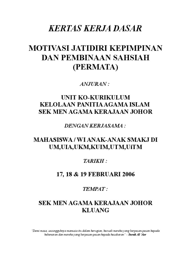 Kertas kerja ini bertujuan untuk mendapatkan kelulusan Pengarah Kolej Matrikulasi Kedah Kementerian Pendidikan Malaysia bagi mengadakan Kem Motivasi KAKOM semester satu 2013 2014. Contoh Kertas Kerja Program Motivasi December 2021 0. Contoh kertas kerja berikut adalah penting sebagai rujukan anda yang ingin melakukan sesuatu seminar kerja.